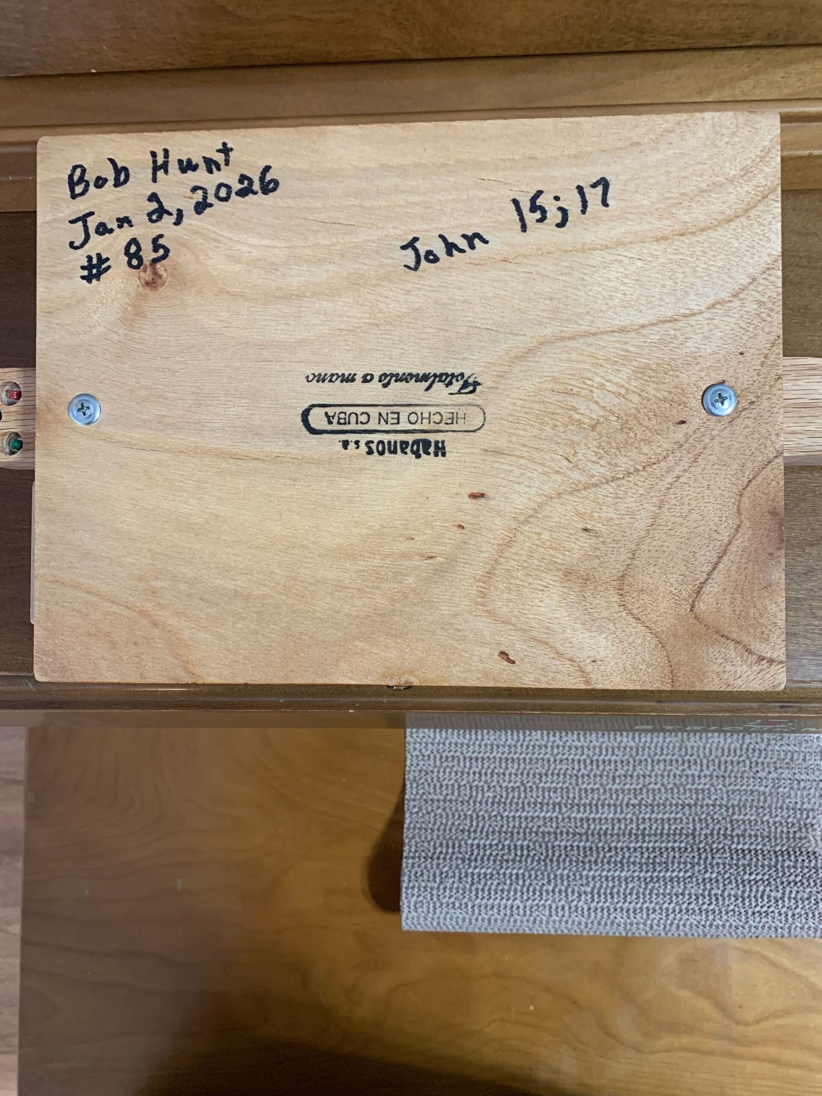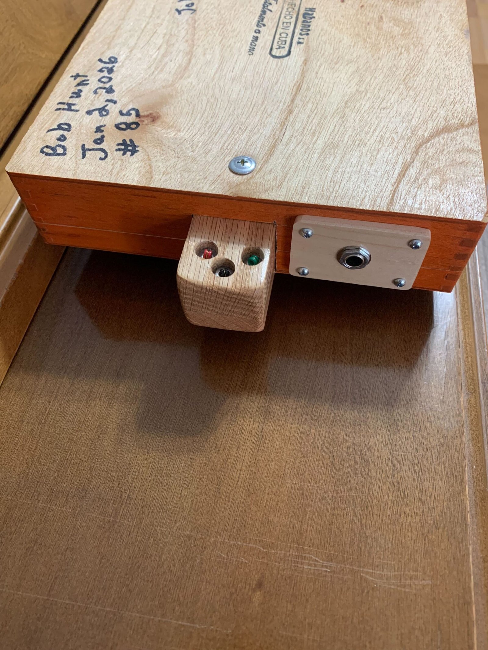 This 3 string Cigar Box Guitar is made with a Cohiba Cigar box and is signed and dated by Bob. If you have any questions about this #85 Cohiba CBG email Bob @ bobs3stringers@outlook.com. This Guitar is handcrafted by Bob Hunt in his shop in Manitou Manitoba Canada.